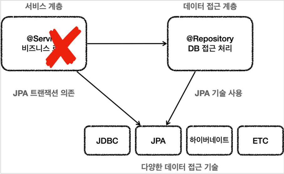 현재 서비스 계층은 트랜잭션을 사용하기 위해서 JDBC 기술에 의존하고 있다. 향후 JDBC에서 JPA 같은 다른 데이터 접근 기술로 변경하면, 서비스 계층의 트랜잭션 관련 코드도 모두 함께 수정해야 한다.