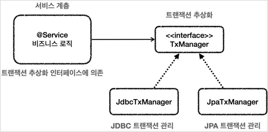 - 서비스는 특정 트랜잭션 기술에 직접 의존하는 것이 아니라, TxManager라는 추상화된 인터페이스에 의존한다. 이제 원하는 구현체를 DI를 통해서 주입하면 된다. 예를 들어서 JDBC 트랜잭션 기능이 필요하면 JdbcTxManager를 서비스에 주입하고, JPA 트랜잭션 기능으로 변경해야 하면 JpaTxManager를 주입하면 된다.