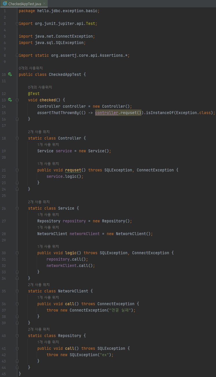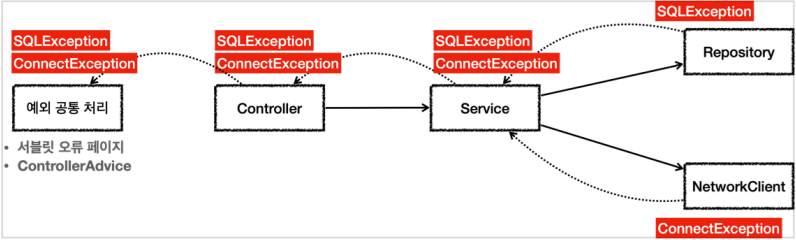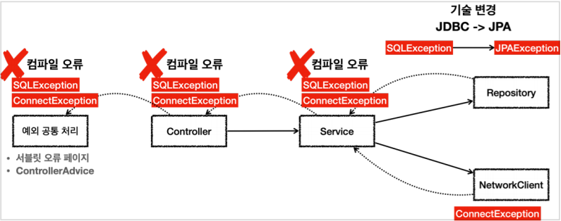 class Controller { public void request() throws SQLException, ConnectException { service.logic(); } } class Service { public void logic() throws SQLException, ConnectException { repository.call(); networkClient.call(); } }throws SQLException, ConnectException처럼 예외를 던지는 부분을 코드에 선언하는 것이 왜 문제가 될까?