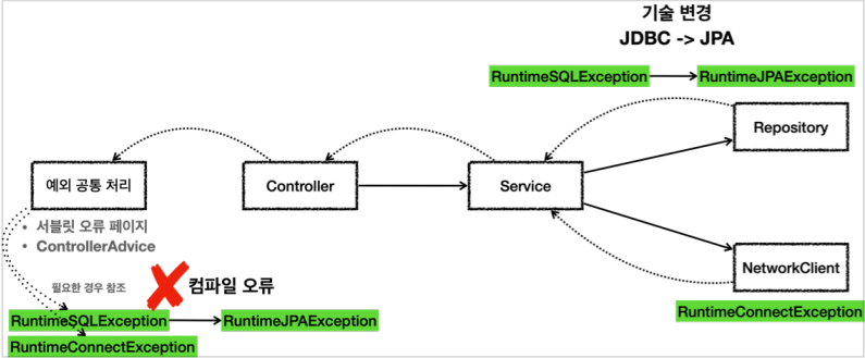 런타임 예외 구현 기술 변경 시 파급 효과