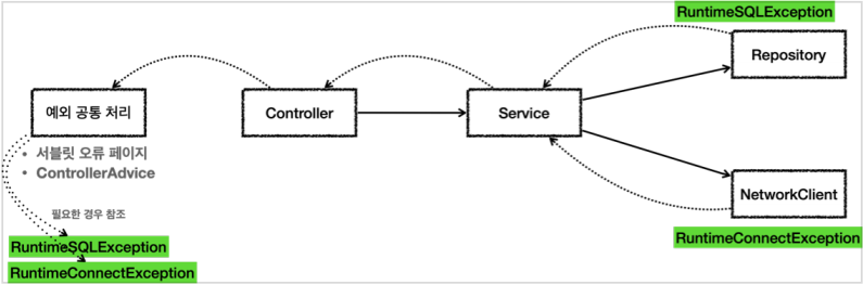 class Controller { public void request() { service.logic(); } } class Service { public void logic() { repository.call(); networkClient.call(); } }런타임 예외이기 때문에 컨트롤러나 서비스가 예외를 처리할 수 없다면 다음 부분을 생략할 수 있다.