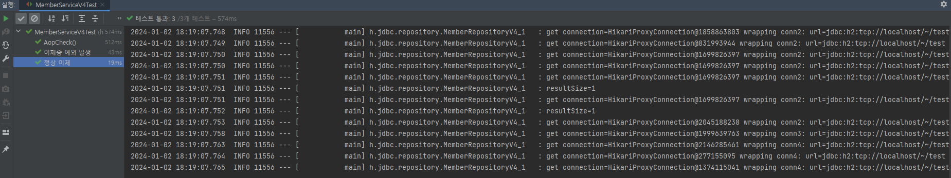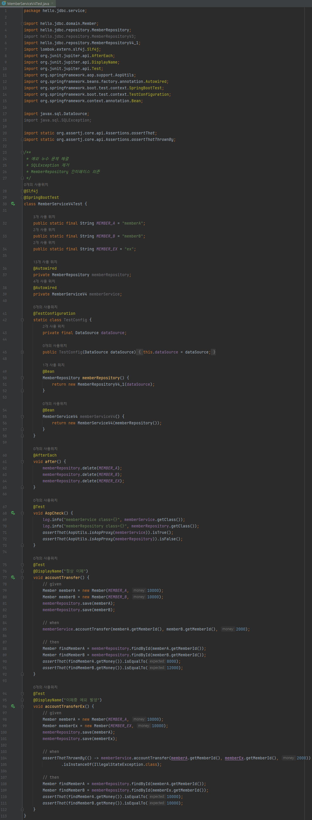 - MemberServiceV3_3와 비교해서 보면 드디어 메서드에서 throws SQLException 부분이 제거된 것을 확인할 수 있다.