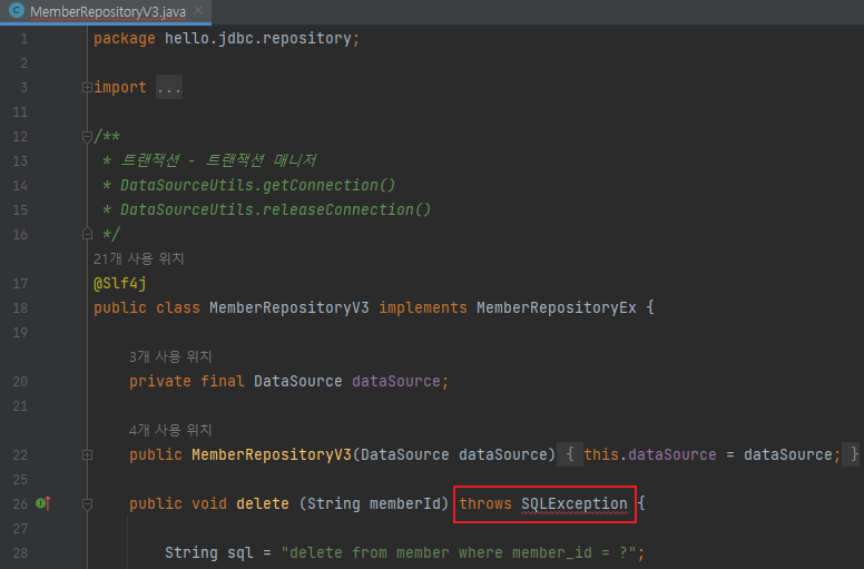 @Slf4j public class MemberRepositoryV3 implements MemberRepositoryEx { public Member save(Member member) throws SQLException { String sql = "insert into member(member_id, money) values(?, ?)"; } }- 인터페이스의 구현체가 체크 예외를 던지려면, 인터페이스 메서드에 먼저 체크 예외를 던지는 부분이 선언되어 있어야 한다. 그래야 구현 클래스의 메서드도 체크 예외를 던질 수 있다.