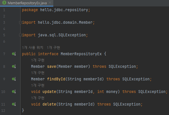 package hello.jdbc.repository; import hello.jdbc.domain.Member; import java.sql.SQLException; public interface MemberRepositoryEx { Member save(Member member); Member findById(String memberId); void update(String memberId, int money); void delete(String memberId); }