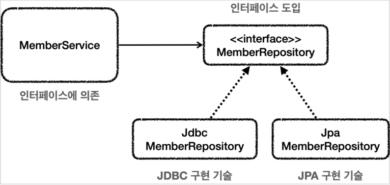 - 덕분에 향후 JDBC에서 다른 구현 기술로 변경하더라도 서비스 계층의 코드를 변경하지 않고 유지할 수 있다.