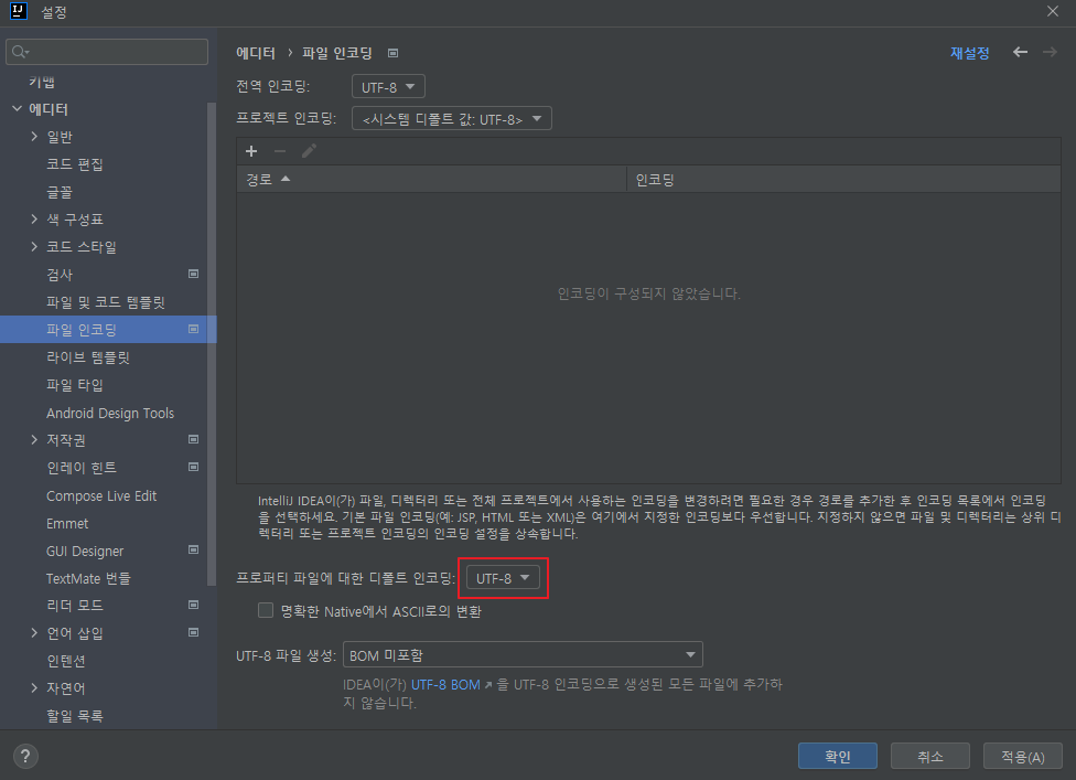 설정 -> 파일 인코딩 -> 프로퍼티 파일에 대한 디폴트 인코딩을 UTF-8로 변경