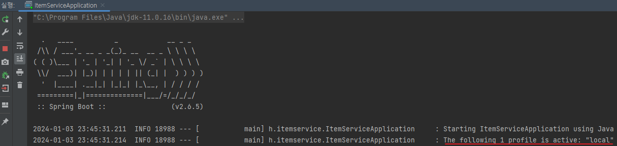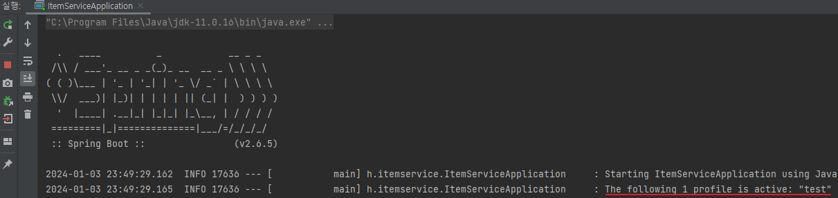 - spring.profiles.active=test로 설정하면 스프링은 test라는 프로필로 동작한다. 이 경우 직전에 설명한 @Profile("local")는 프로필 정보가 맞지 않아서 동작하지 않는다. 따라서 testDataInit이라는 스프링 빈도 등록되지 않고, 초기 데이터도 추가하지 않는다
