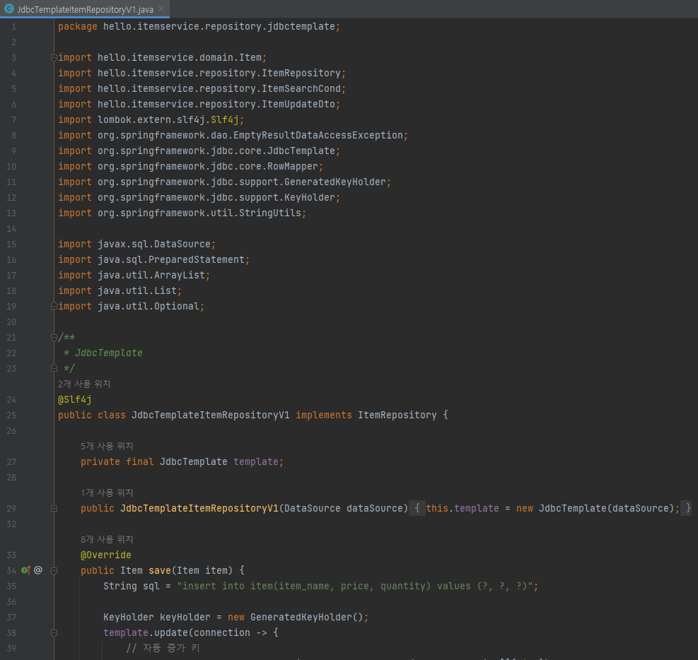 - JdbcTemplateItemRepositoryV1() 생성자를 보면 dataSource를 의존 관계 주입받고 생성자 내부에서 JdbcTemplate을 생성한다. 스프링에서는 JdbcTemplate을 사용할 때 관례상 이 방법을 많이 사용한다.