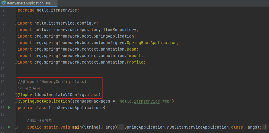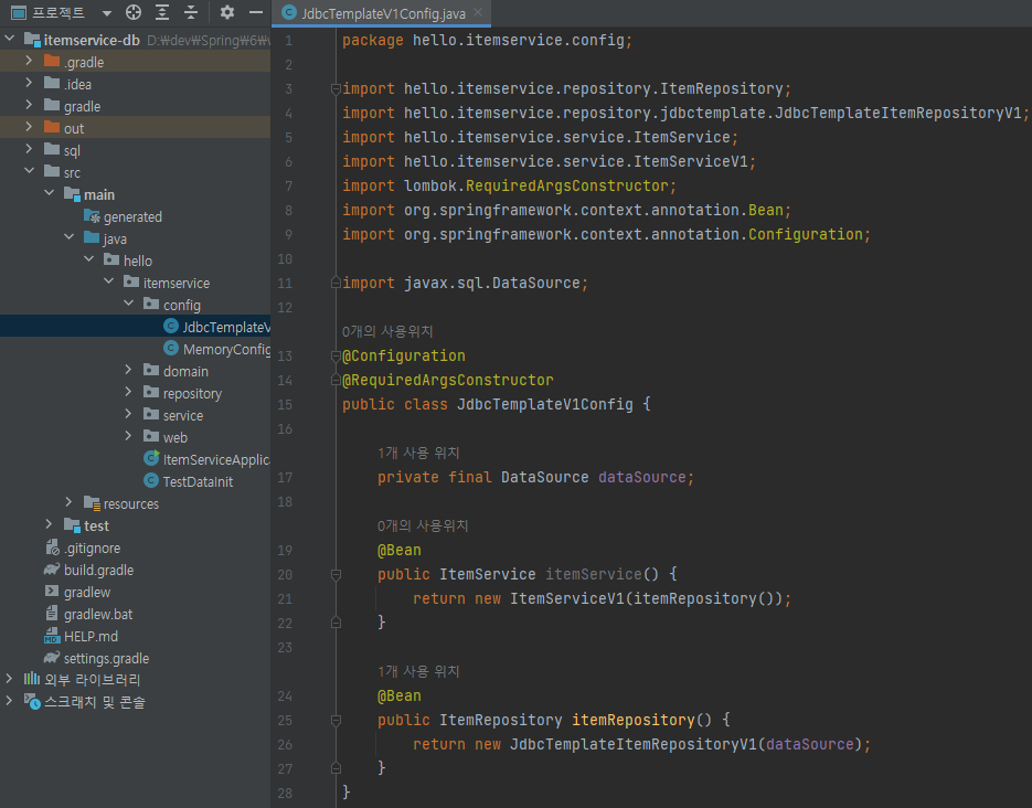 main/java/hello/itemservice/config/JdbcTemplateV1Config 생성