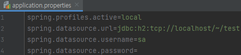 spring.profiles.active=local spring.datasource.url=jdbc:h2:tcp://localhost/~/test spring.datasource.username=sa spring.datasource.password=