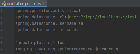 spring.profiles.active=local spring.datasource.url=jdbc:h2:tcp://localhost/~/test spring.datasource.username=sa spring.datasource.password= #jdbcTemplate sql log logging.level.org.springframework.jdbc=debug