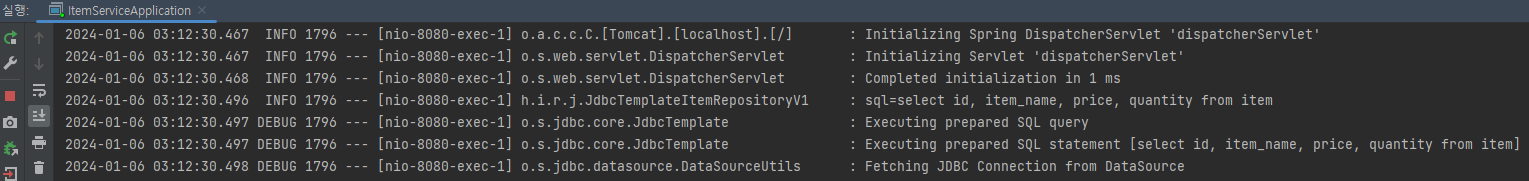 - ItemRepository 구현체로 JdbcTemplateItemRepositoryV1이 사용되도록 했다. 이제 메모리 저장소가 아니라 실제 DB에 연결하는 JdbcTemplate이 사용된다.