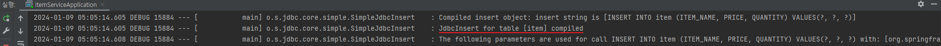 DEBUG 39424 --- [ main] o.s.jdbc.core.simple.SimpleJdbcInsert : Compiled insert object: insert string is [INSERT INTO item (ITEM_NAME, PRICE, QUANTITY) VALUES(?, ?, ?)]