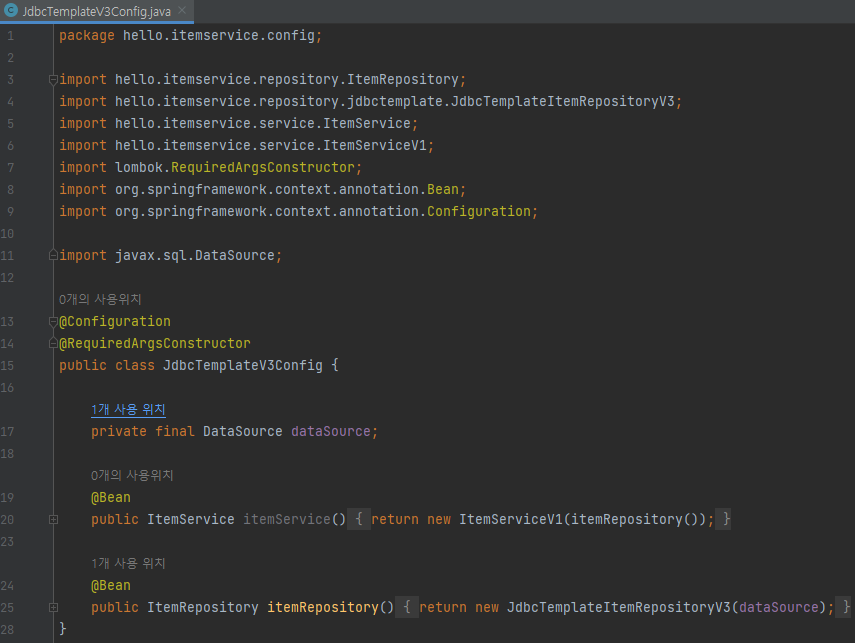 - 앞서 개발한 JdbcTemplateItemRepositoryV3를 사용하도록 스프링 빈에 등록한다.