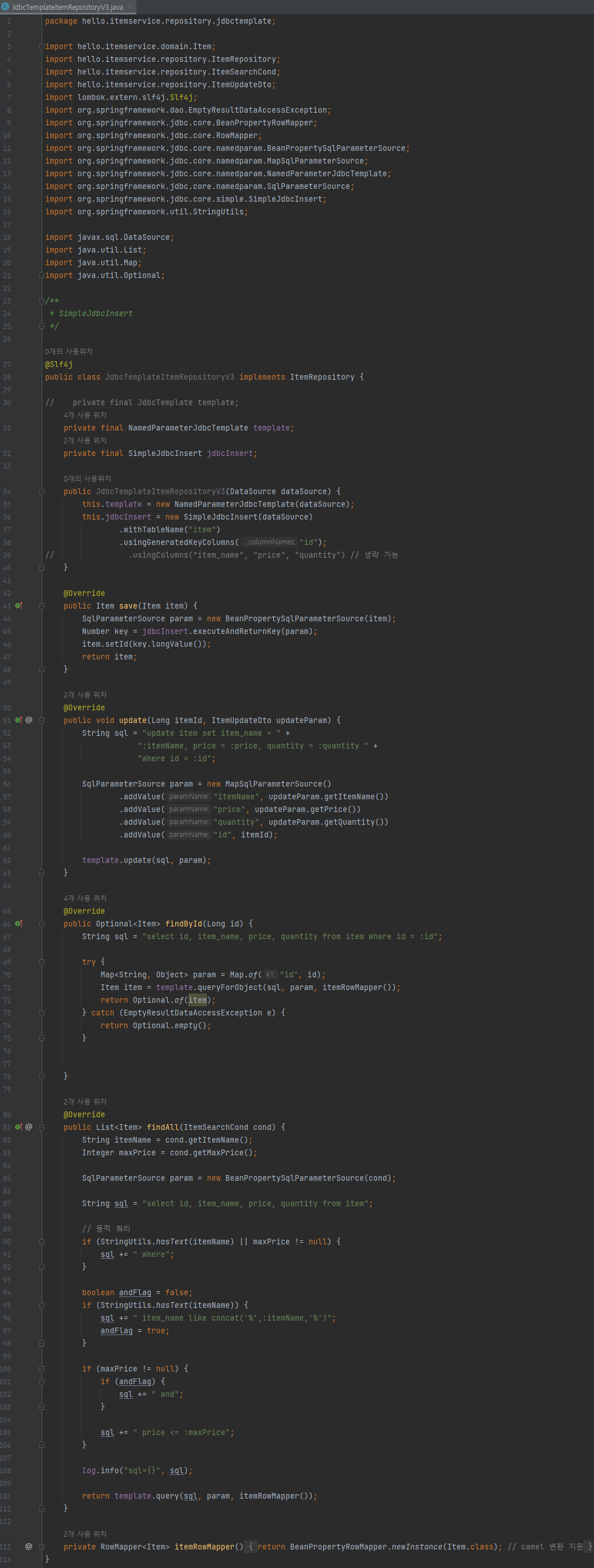 - JdbcTemplateItemRepositoryV2를 복사해서 JdbcTemplateItemRepositoryV3 만듦