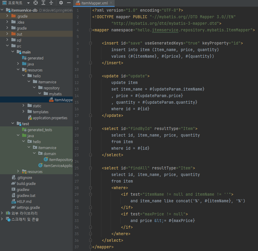 List<Item> findAll(ItemSearchCond itemSearch); <select id="findAll" resultType="Item"> select id, item_name, price, quantity from item <where> <if test="itemName != null and itemName != ''"> and item_name like concat('%',#{itemName},'%') </if> <if test="maxPrice != null"> and price <= #{maxPrice} </if> </where> </select>- Mybatis는 <where>, <if> 같은 동적 쿼리 문법을 통해 편리한 동적 쿼리를 지원한다.