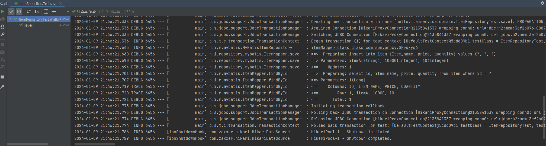 - 마이바티스 스프링 연동 모듈이 만들어주는 ItemMapper의 구현체 덕분에 인터페이스 만으로 편리하게 XML의 데이터를 찾아서 호출할 수 있다.