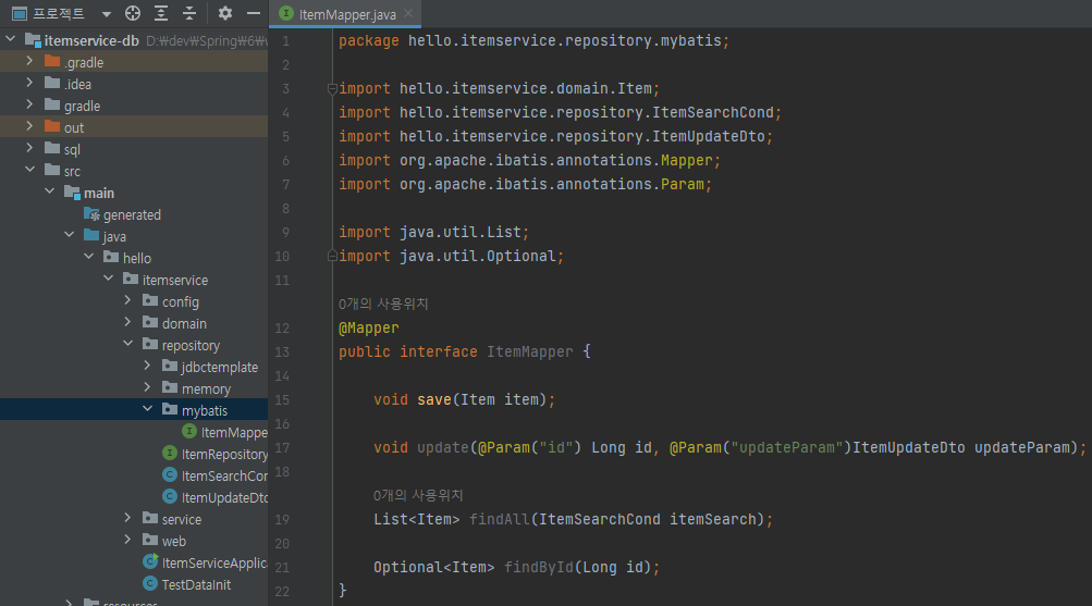 - ItemMapper 인터페이스의 구현체에 대한 부분은 뒤에 별도로 설명한다.