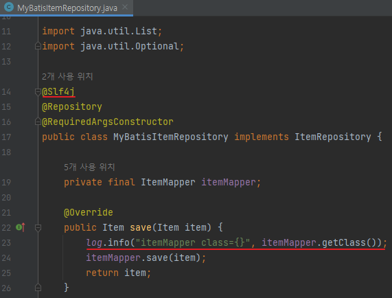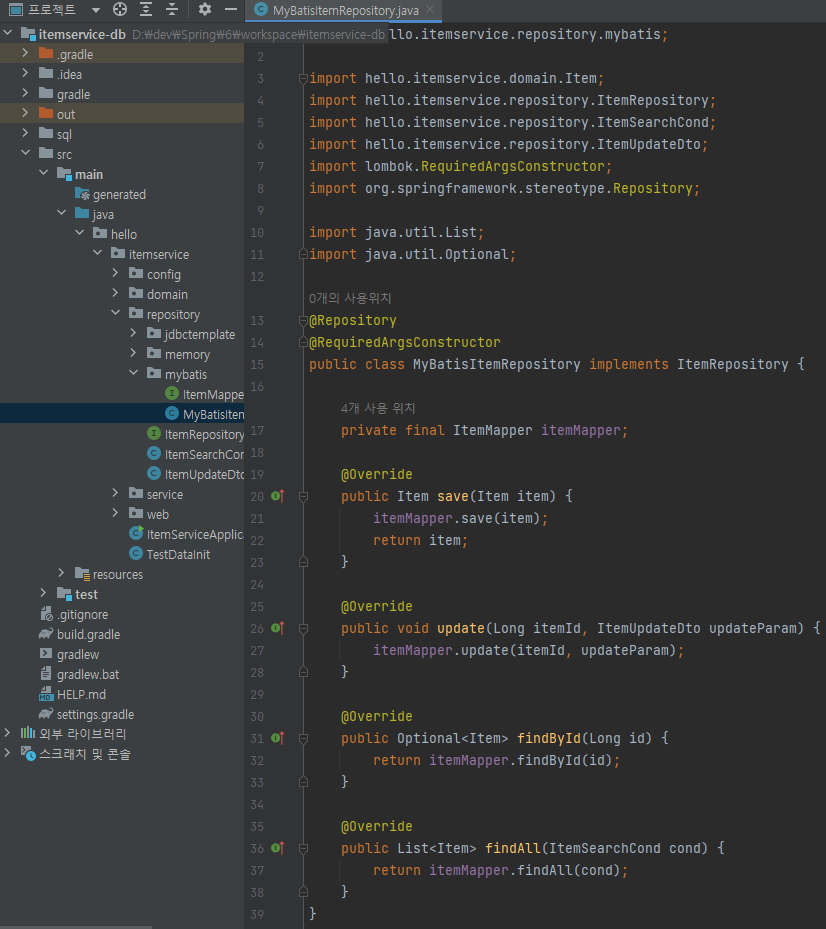 - MyBatisItemRepository는 단순히 ItemMapper에 기능을 위임한다.