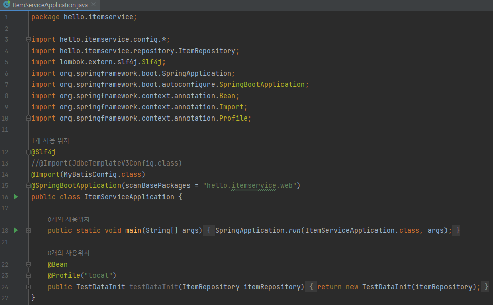 - @Import(MyBatisConfig.class) : 앞서 설정한 MyBatisConfig.class를 사용하도록 설정했다.