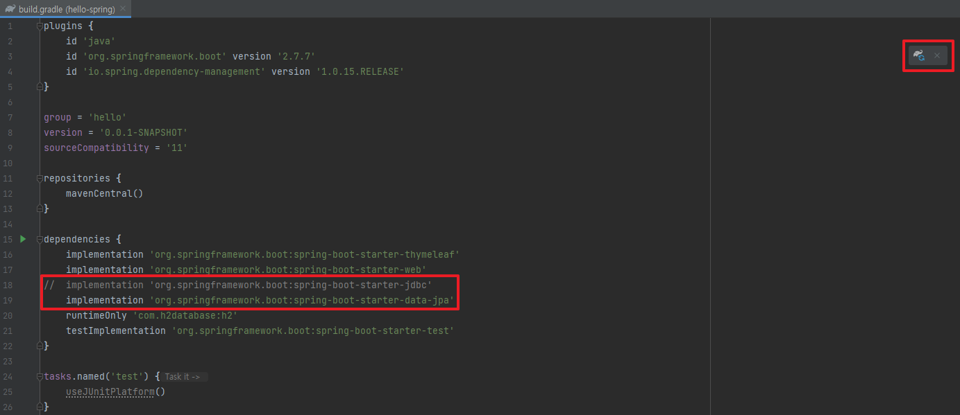 implementation 'org.springframework.boot:spring-boot-starter-data-jpa' 추가 후 오른쪽 코끼리 클릭