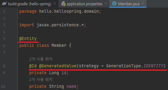 @Entity 추가함으로써 jpa가 관리하는 entity가 됨