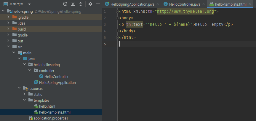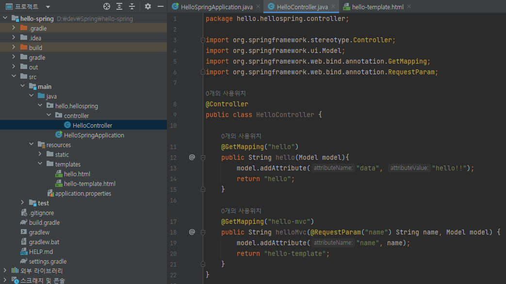 기존 controller(hello.hellospring/controller/HelloController)에 "hello-mvc"관련 코드 추가