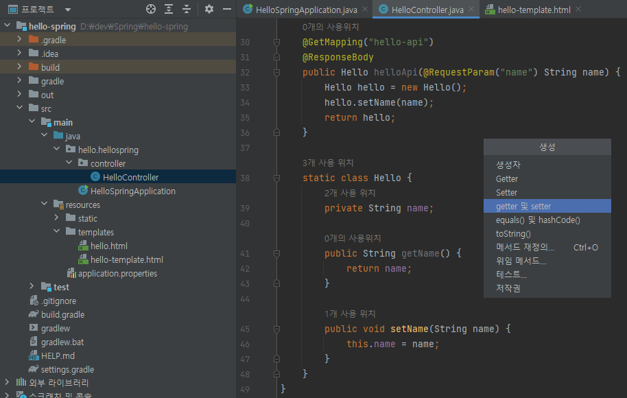 Alt키 + Ins키 -> getter 및 setter 생성