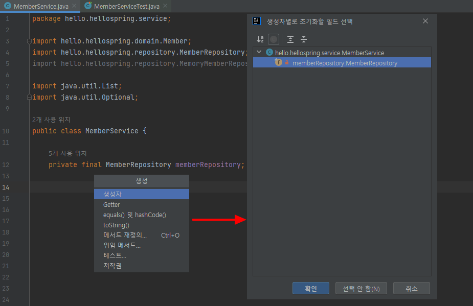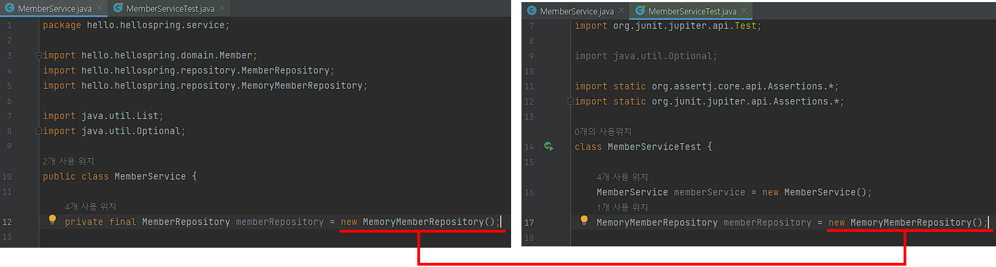 MemberService와 MemberServiceTest에서 사용하는 Repository가 다르기 때문에 같도록 변경 필요