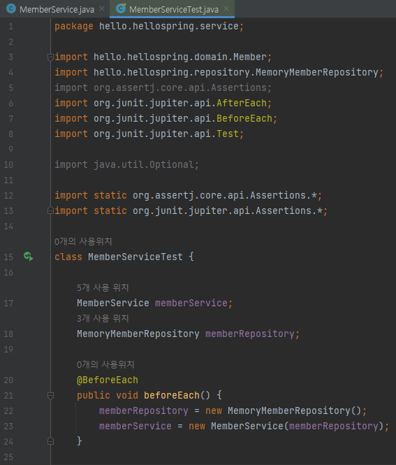 각 테스트를 실행하기 전에 beforeEach를 먼저 실행하여 Repository를 넣어줌