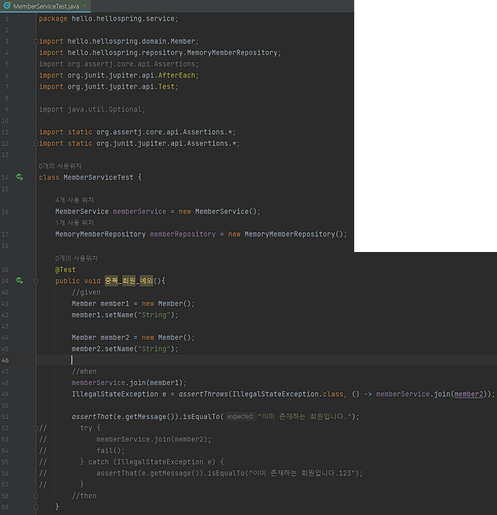 // assertThat(e.getMessage()).isEqualTo("이미 존재하는 회원입니다.123");