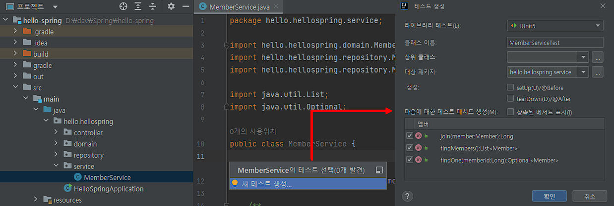 Ctrl + Shift + t키로 main에서 테스트 생성 가능