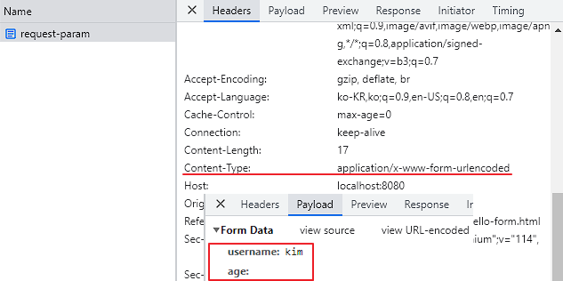 - 메시지 바디에 쿼리 파라미터 형식으로 전달 username=hello&age=20