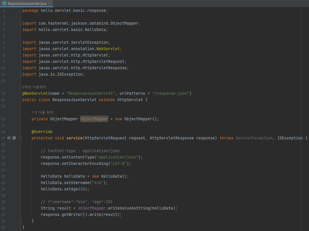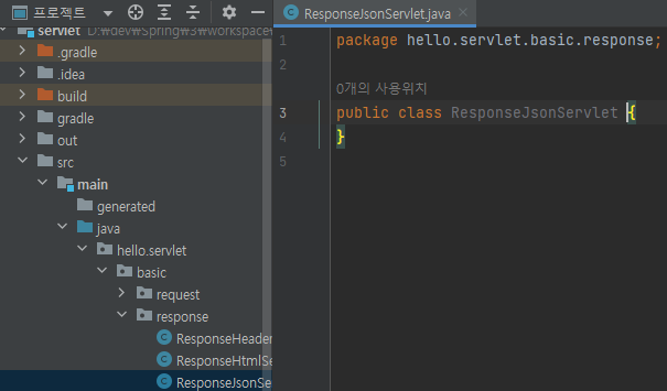 main/java/hello.servlet/basic/response/ResponseJsonServlet 생성