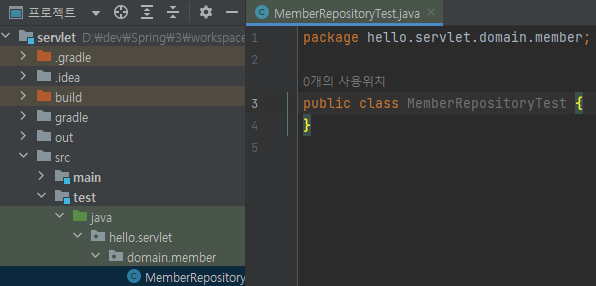 test/java/hello.servlet/domain/member/MemberRepositoryTest 생성