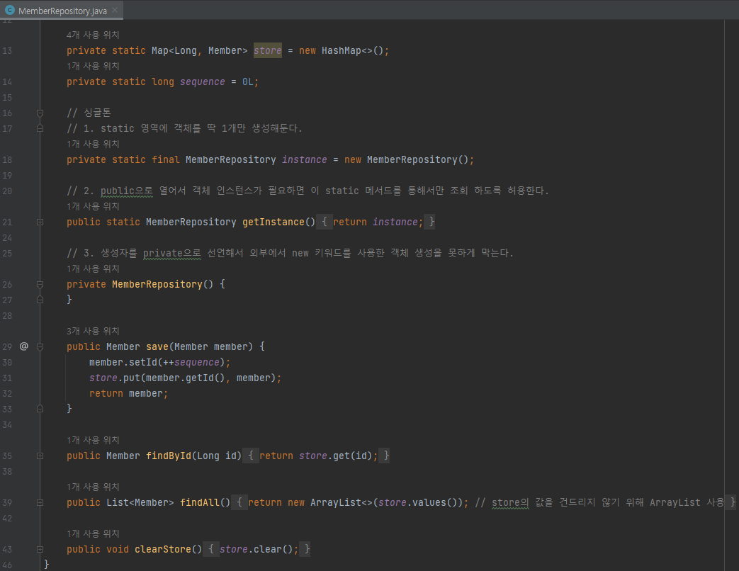 MemberRepository memberRepository = MemberRepository.getInstance(); // 싱글톤이라서 new X