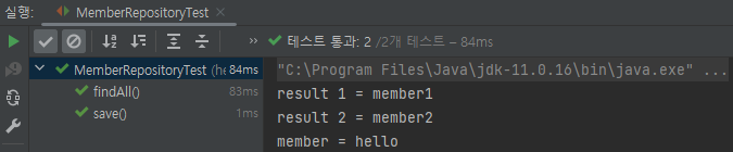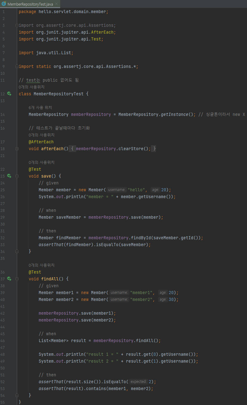 회원을 저장하고, 목록을 조회하는 테스트를 작성했다. 각 테스트가 끝날 때, 다음 테스트에 영향을 주지 않도록 각 테스트의 저장소를 clearStore()를 호출해서 초기화했다.