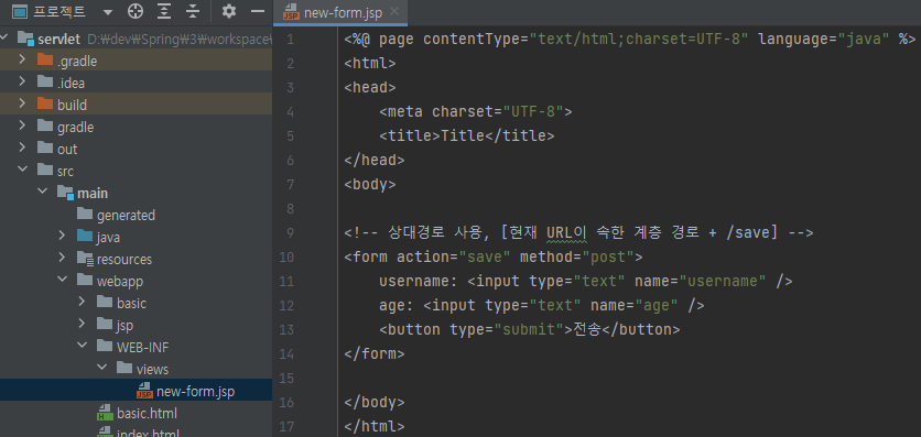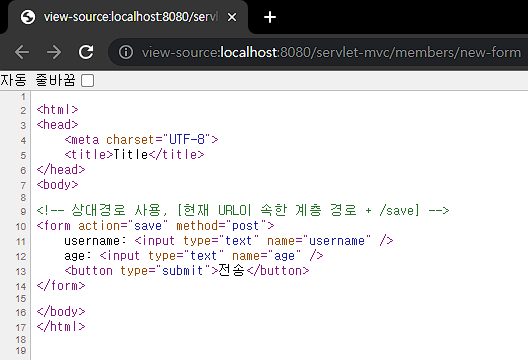 <%@ page contentType="text/html;charset=UTF-8" language="java" %> <html> <head> <meta charset="UTF-8"> <title>Title</title> </head> <body> <!-- 상대경로 사용, [현재 URL이 속한 계층 경로 + /save] --> <form action="save" method="post"> username: <input type="text" name="username" /> age: <input type="text" name="age" /> <button type="submit">전송</button> </form> </body> </html>