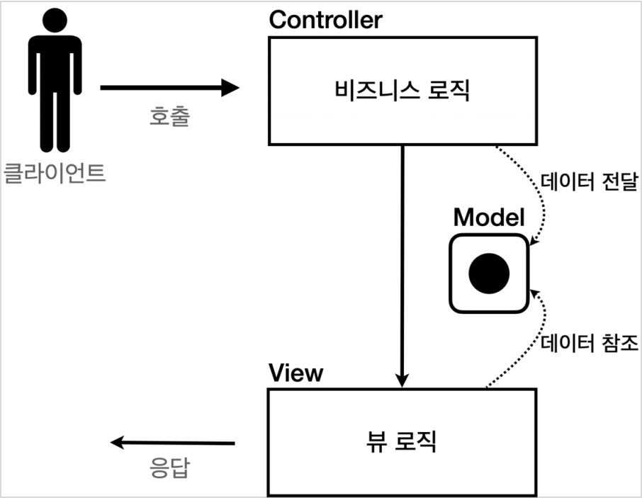 - 모델 : 뷰에 출력할 데이터를 담아둔다. 뷰가 필요한 데이터를 모두 모델에 담아서 전달해 주는 덕분에 뷰는 비즈니스 로직이나 데이터 접근을 몰라도 되고, 화면을 렌더링 하는 일에 집중할 수 있다.