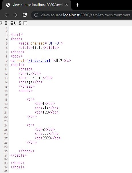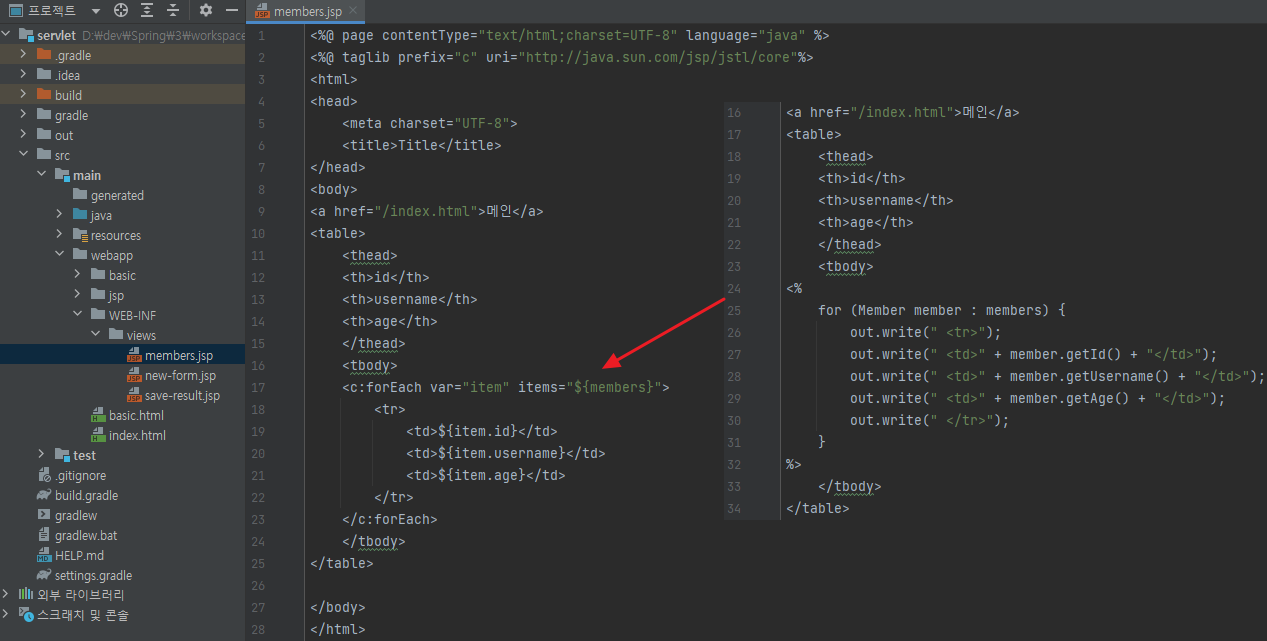 모델에 담아둔 members를 JSP가 제공하는 taglib기능을 사용해서 반복하면서 출력했다.