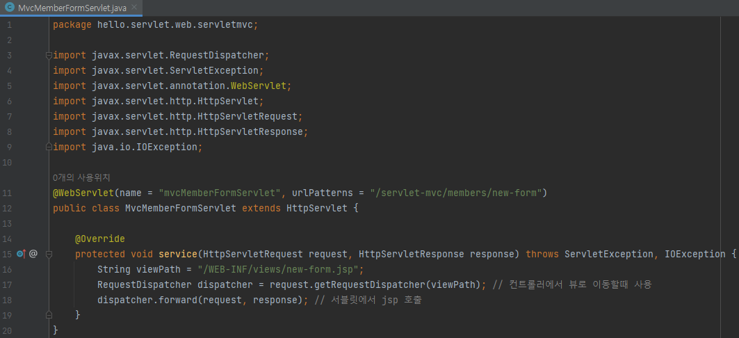 package hello.servlet.web.servletmvc; import javax.servlet.RequestDispatcher; import javax.servlet.ServletException; import javax.servlet.annotation.WebServlet; import javax.servlet.http.HttpServlet; import javax.servlet.http.HttpServletRequest; import javax.servlet.http.HttpServletResponse; import java.io.IOException; @WebServlet(name = "mvcMemberFormServlet", urlPatterns = "/servlet-mvc/members/new-form") public class MvcMemberFormServlet extends HttpServlet { @Override protected void service(HttpServletRequest request, HttpServletResponse response) throws ServletException, IOException { String viewPath = "/WEB-INF/views/new-form.jsp"; RequestDispatcher dispatcher = request.getRequestDispatcher(viewPath); // 컨트롤러에서 뷰로 이동할 때 사용 dispatcher.forward(request, response); // 서블릿에서 jsp 호출 } }