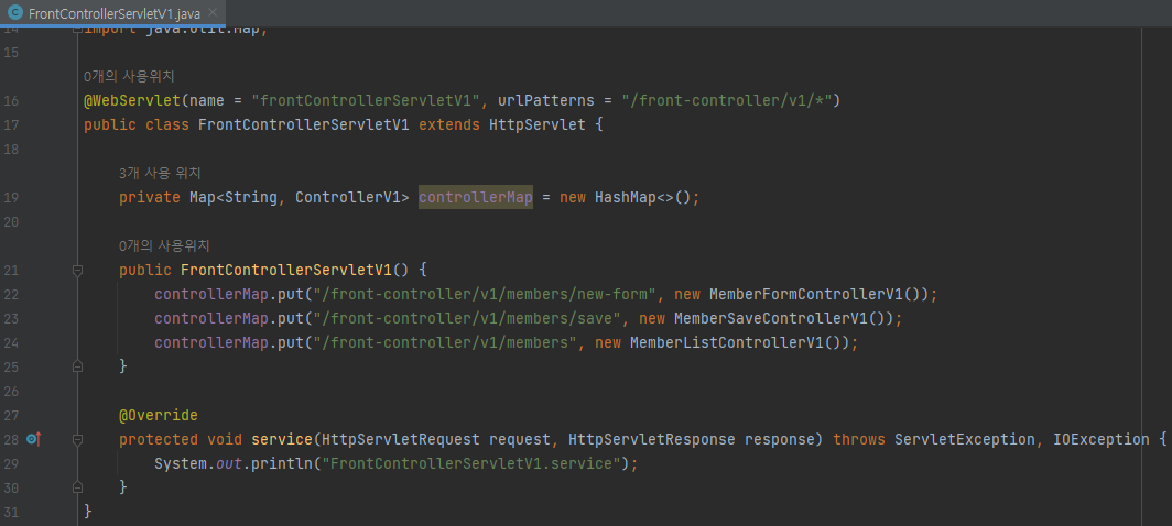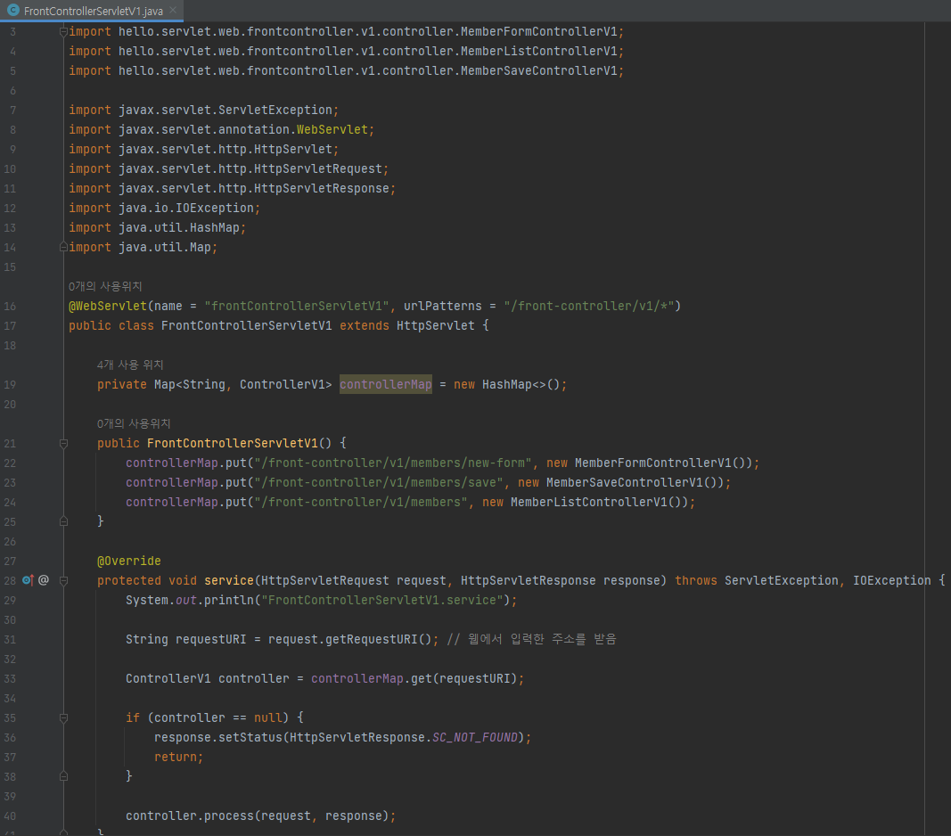 - urlPatterns = "/front-controller/v1/*" : /front-controller/v1를 포함한 하위 모든 요청은 이 서블릿에서 받아들인다.
