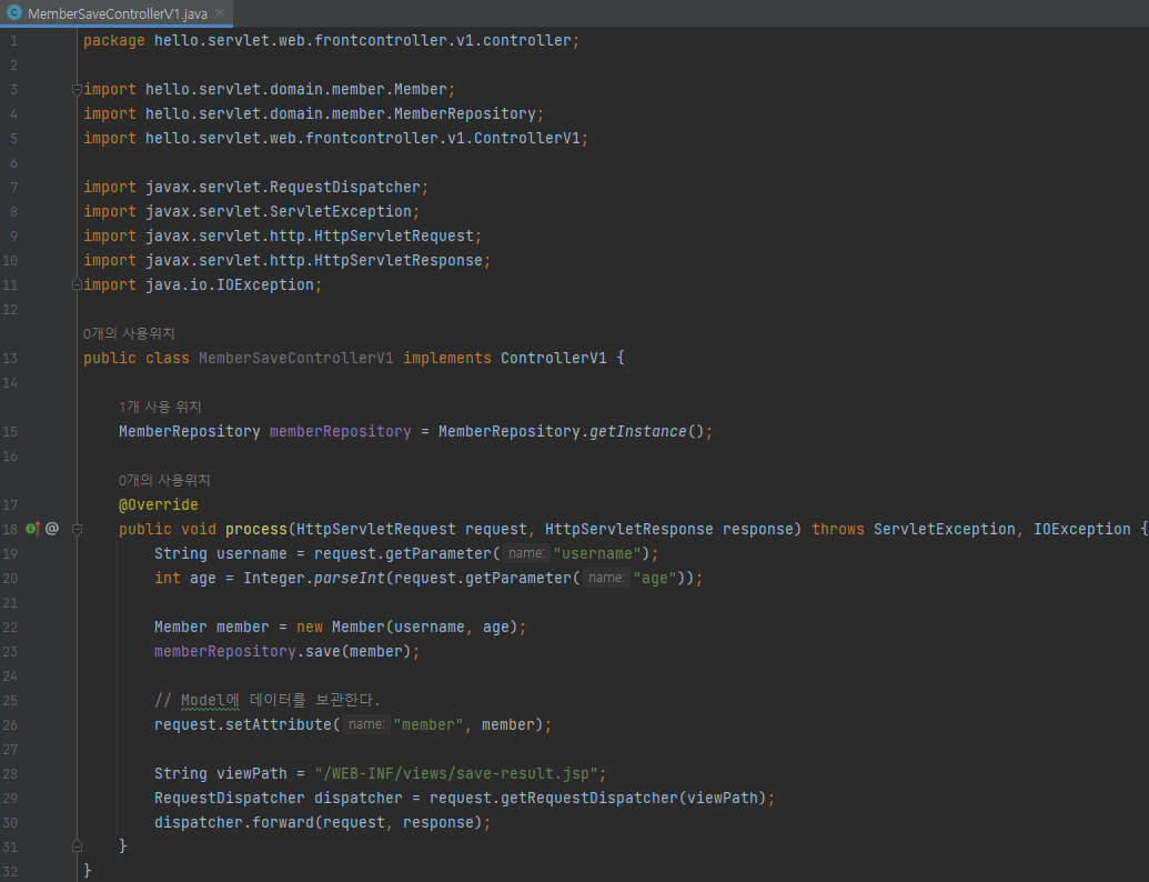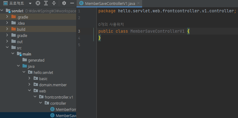 main/java/hello.servlet/web/frontcontroller/v1/controller/MemberSaveControllerV1 생성
