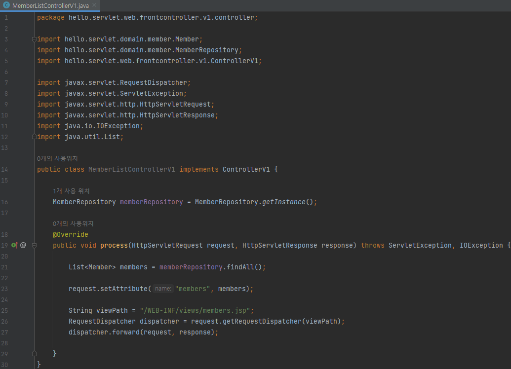 main/java/hello.servlet/web/frontcontroller/v1/controller/MemberListControllerV1 생성