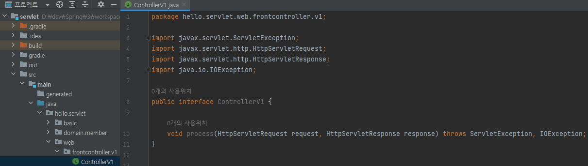 main/java/hello.servlet/web/frontcontroller/v1/ControllerV1 생성