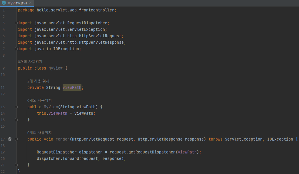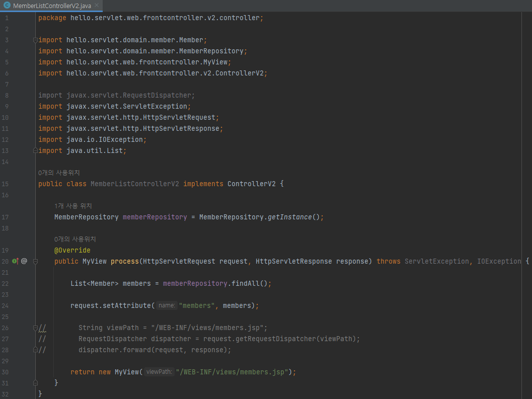 이제 각 컨트롤러는 복잡한 dispatcher.forward()를 직접 생성해서 호출하지 않아도 된다. 단순히 MyView 객체를 생성하고 거기에 뷰 이름만 넣고 반환하면 된다.