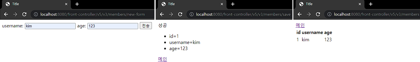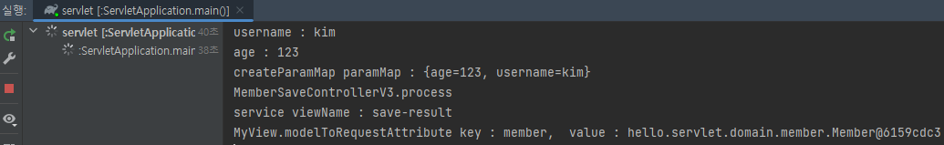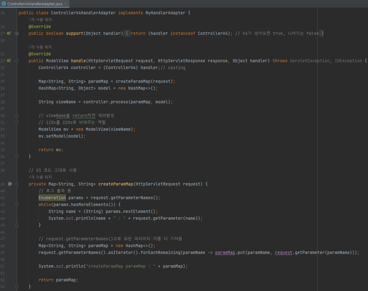 ControllerV3 controller = (ControllerV3) handler; Map<String, String> paramMap = createParamMap(request); ModelView mv = controller.process(paramMap); return mv;handler를 컨트롤러 V3로 변환한 다음에 V3 형식에 맞도록 호출한다.