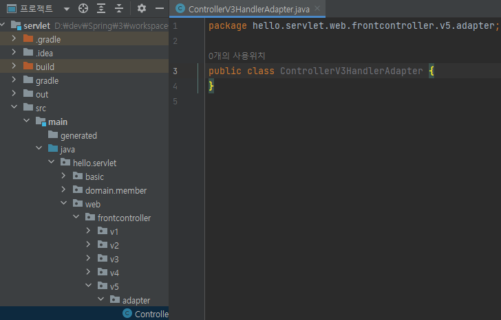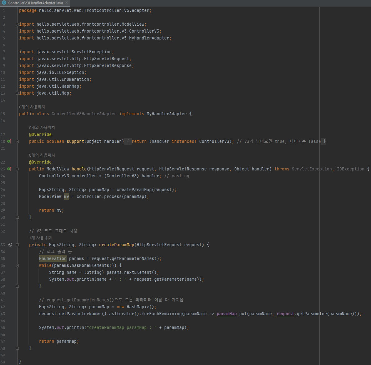 main/java/hello.servlet/web/frontcontroller/v5/adapter/ControllerV3HandlerAdapter 생성