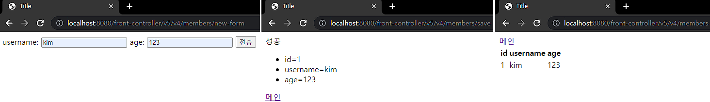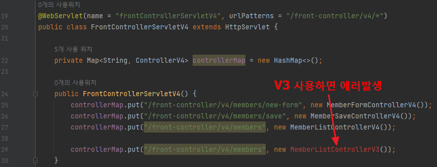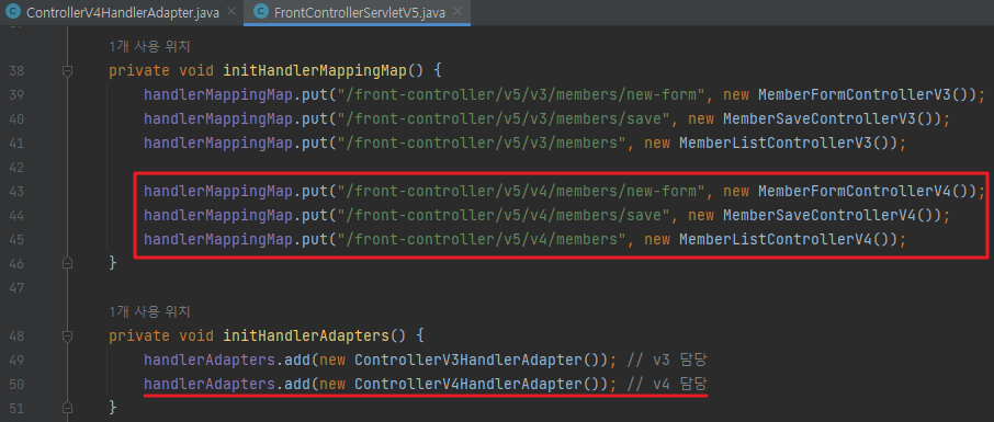 핸들러 매핑(handlerMappingMap)에 ControllerV4를 사용하는 컨트롤러를 추가하고, 해당 컨트롤러를 처리할 수 있는 어댑터인 ControllerV4HandlerAdapter도 추가하자.