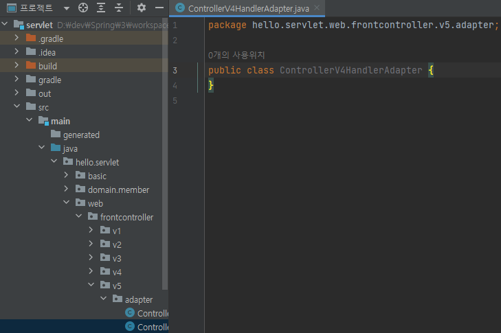 main/java/hello.servlet/web/frontcontroller/v5/adapter/ControllerV4HandlerAdapter 생성